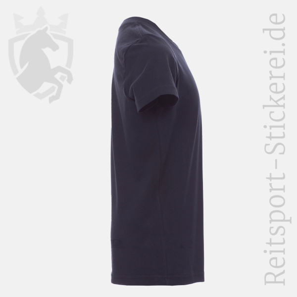 Wählt "Brustlogo klein (Bild 1)", um dieses T-Shirt mit einem kleinen Logo auf der linken Brustseite zu erhalten (der Rücken bleibt unbedruckt). Alternativ könnt Ihr Euch für einen großen, einseitigen Logo-Aufdruck auf Brust (Bild 2) oder Rücken (Bild 3) entscheiden oder für eine beidseitige Bedruckung mit einem kleinen Brust- und einem großen Rückenlogo (Bild 1+3). Diese Variante gibt es auch zusätzlich mit bedrucktem rechten Ärmel (Bild 1,3+4). Auf Wunsch ist auch ein kleiner Name oder individueller Text (max. 2 Zeilen / max. 10 cm breit) auf der rechten Brustseite möglich (Aufpreis 6,- € pro T-Shirt). Diese Option ist bei T-Shirts nicht auswählbar. Gebt den Personalisierungswunsch bitte unter "Eure Nachricht an die Reitsport-Stickerei" ein. Wir passen die Auftragsbestätigung und Rechnung entsprechend an.