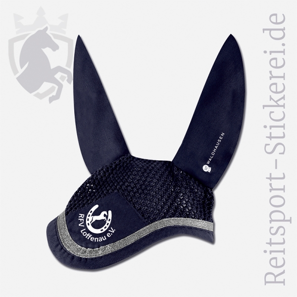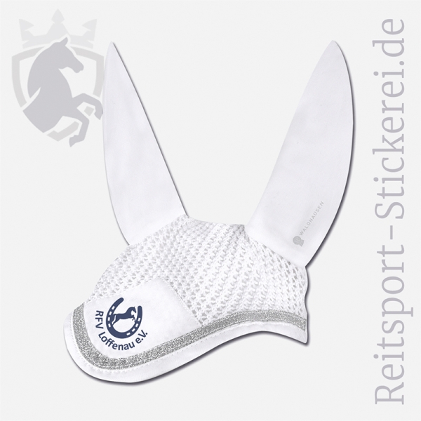 Elegante Fliegenohren in navy oder weiß mit sibernem Glitzerband von Waldhausen. Passend zu unserer Schabracke. Die Ohren bestehen aus glattem Baumwollmischgewebe, die Stirnpartie ist gehäkelt. Hochwertig mit Vereinslogo passend zur Biese bedruckt. Bestellbar in der Größe Warmblut.